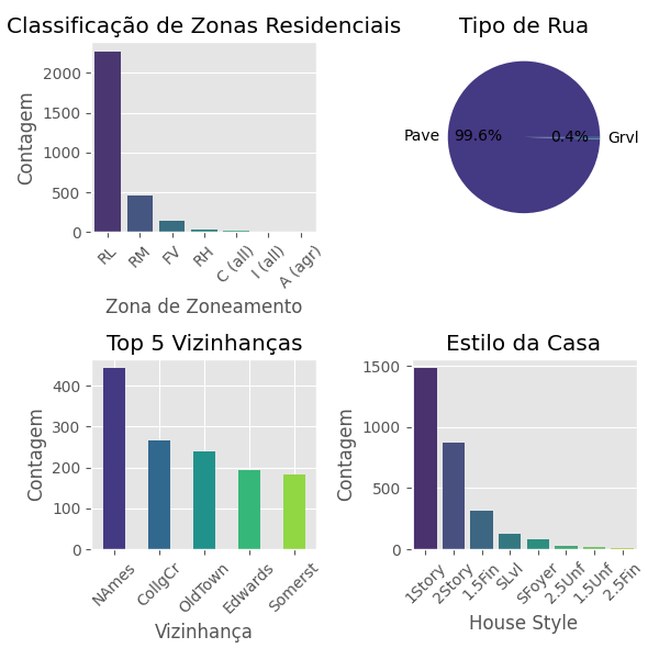Nesta etapa, foi realizada a análise exploratória do dataset AmesHousing.csv, verificando as primeiras linhas, informações gerais, estatísticas descritivas, valores ausentes e visualização de algumas variáveis categóricas.